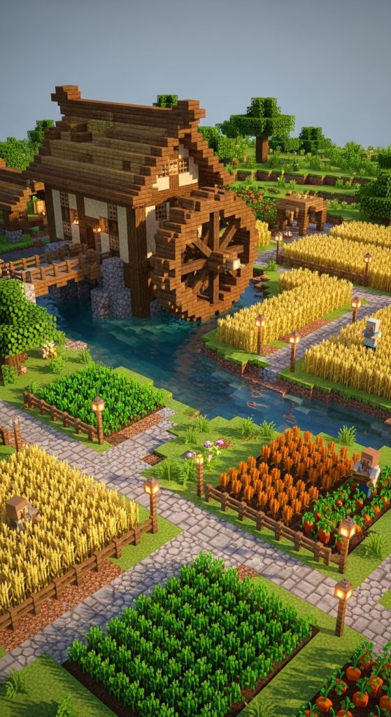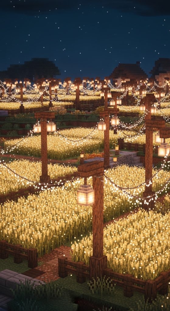 Plant large wheat fields but line every row with hidden glow blocks or lantern posts. Add string lights between wooden poles so the farm glows warmly at night.