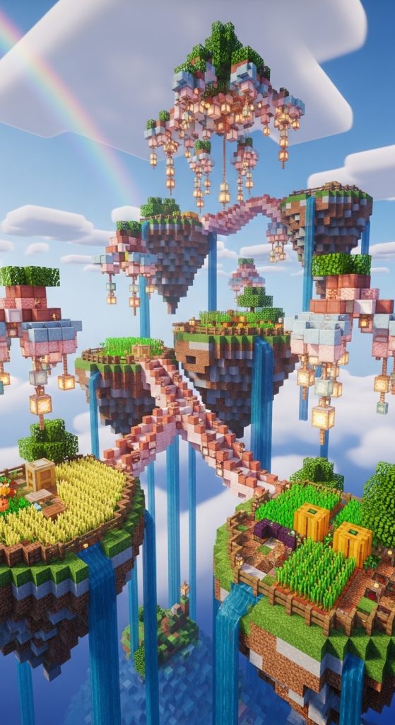 Create floating islands connected by pastel bridges. Each island can host a different farm — carrots, pumpkins, bees, or animals.