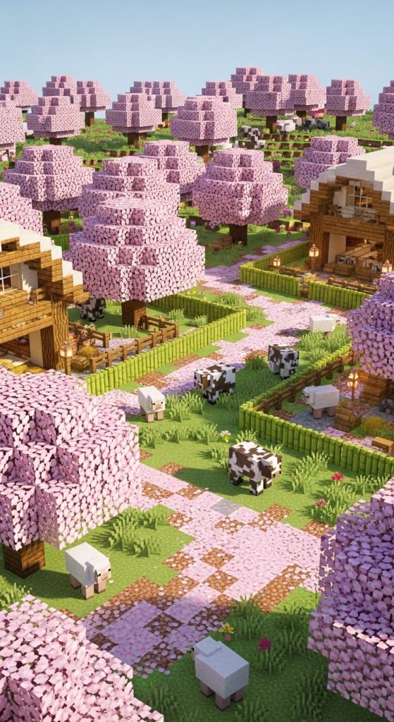 A cherry blossom themed farm is one of the cutest luxury builds you can create.