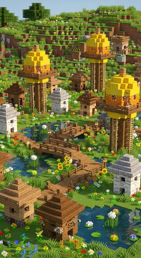 Design a flower valley filled with colorful blooms, custom bee houses, and honeycomb structures. Use yellow glass, oak wood, and glow blocks for warmth.