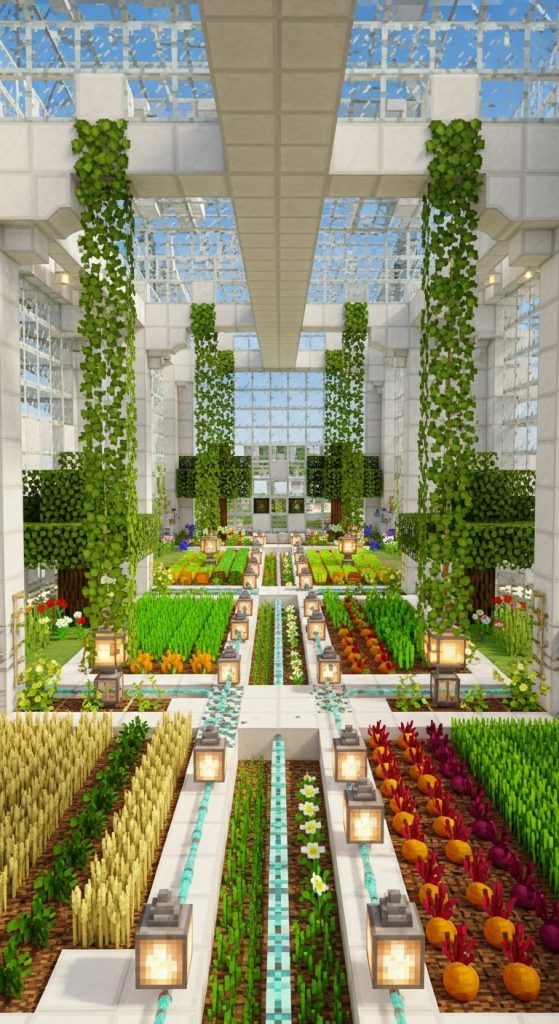 Use glass panes, quartz blocks, and glowstone lighting to create an elegant structure. Inside, organize crops in symmetrical rows with water canals lined in sea lanterns.
