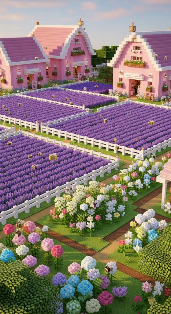 The cottagecore aesthetic fits perfectly into Minecraft. Imagine soft pastel barns, flower paths, and tiny crop fields surrounded by white fences.