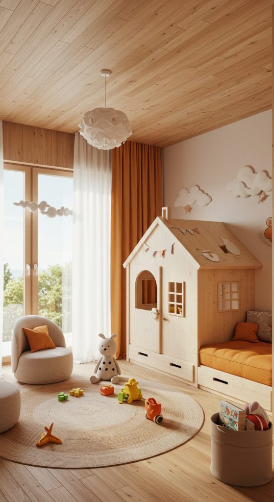 Description: Create a luminous lodge-style nursery. Choose a light color palette to maximize natural light. A large, handcrafted wooden playhouse or a built-in wooden structure adds a focal point and a sense of adventure. Warm wood tones, like oak or pine, dominate the furniture. Add pops of warm ochre or terracotta for a touch of earthy elegance.