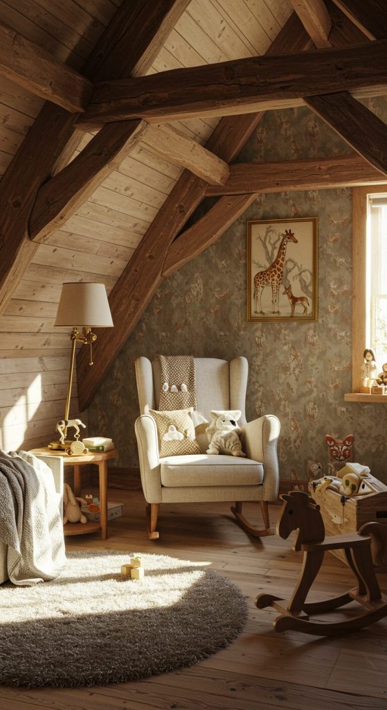 Description: Transport your little one to a cozy cabin in the woods with exposed wood beams, rough-hewn wooden furniture, and animal-print accents. Use a mix of natural textures, such as jute rugs, linen drapes, and wooden toys. A cabin-style cot or crib complements the theme.
