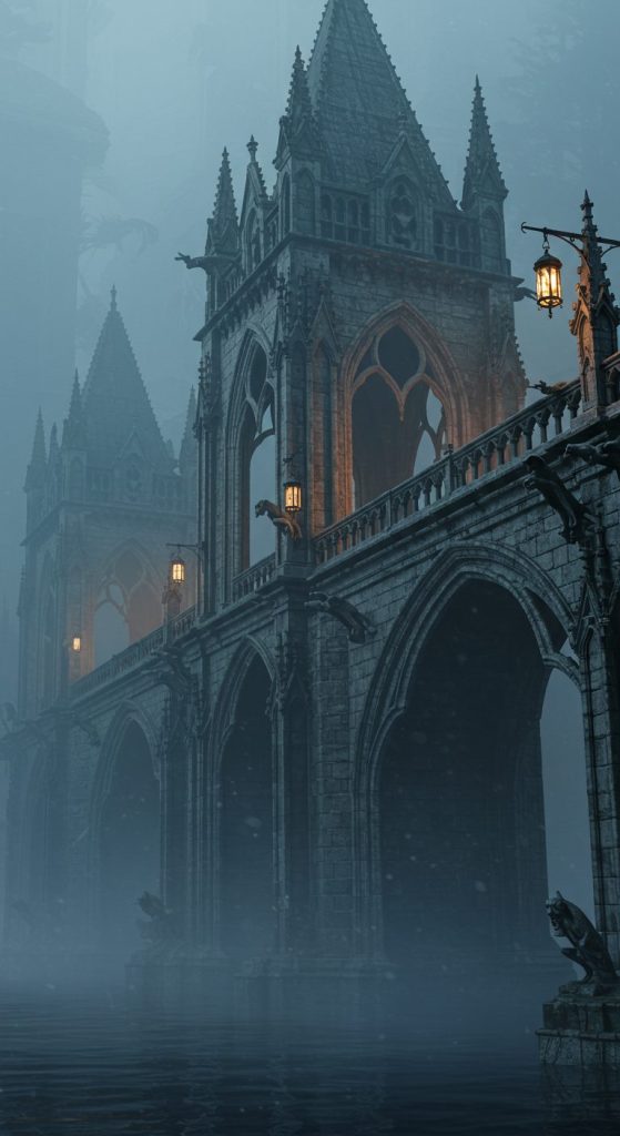 - Gothic Bridge: Ornate arches, gargoyles, foggy river.