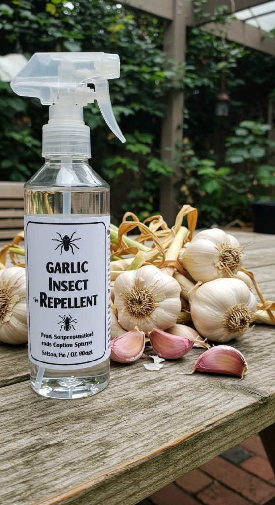 - Garlic spray: Backyard with garlic bulbs and spray bottle.