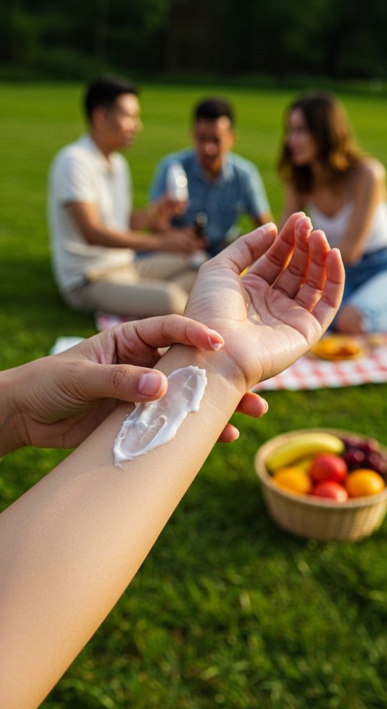 - Lotions: Applying coconut oil blend outdoors.