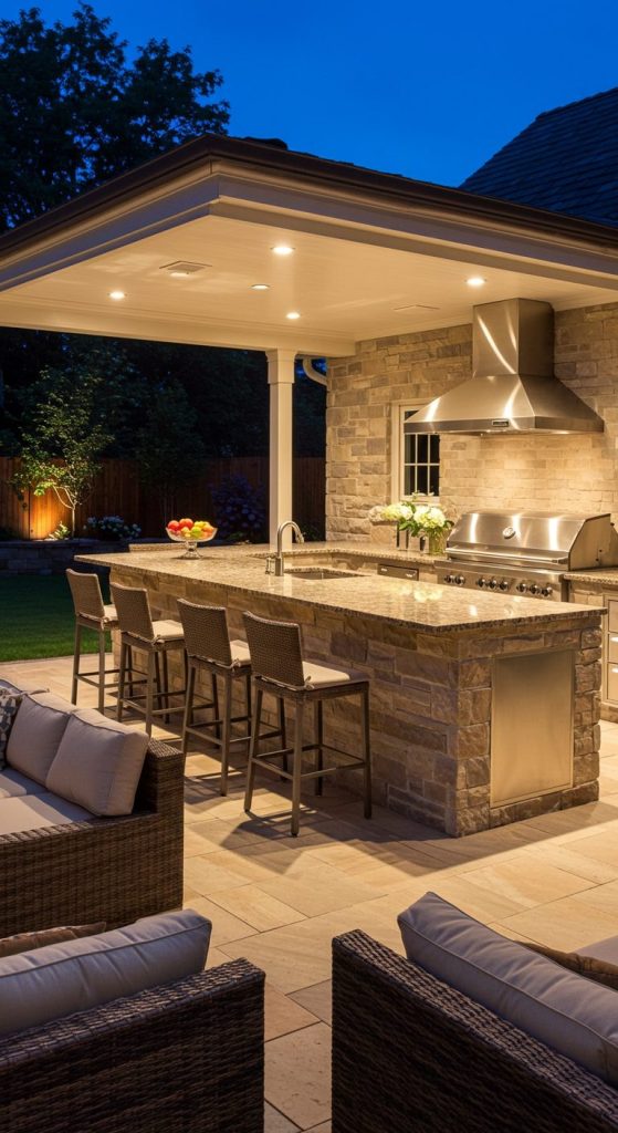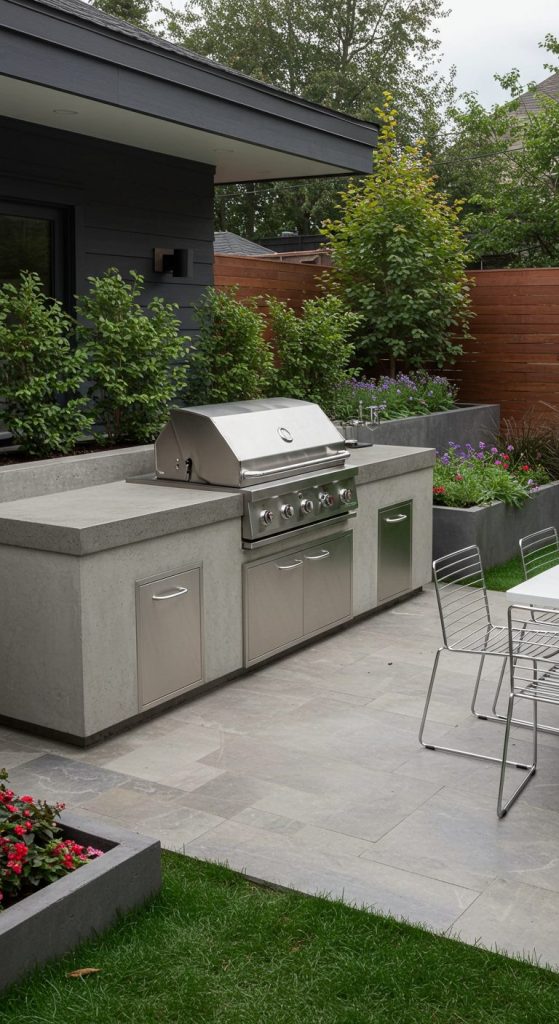 For a contemporary look, opt for a sleek steel grill embedded into a concrete or quartz countertop. Pair with minimalist furniture, such as metal chairs and a simple dining table, for a chic vibe.