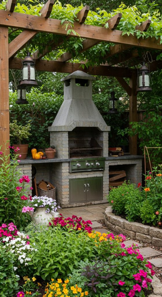 Create a lush, tranquil space by integrating your grill area into a garden setting. Use natural stone, wooden accents, and vibrant plants. Add a pergola or trellis with climbing vines for shade and privacy.