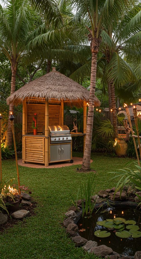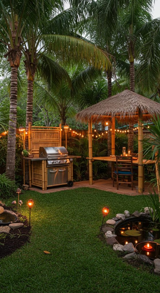 Turn your backyard into a tropical retreat with bamboo fencing, palm trees, and water features like a small pond or fountain. Use a built-in grill with a thatched roof or bamboo canopy for shade.