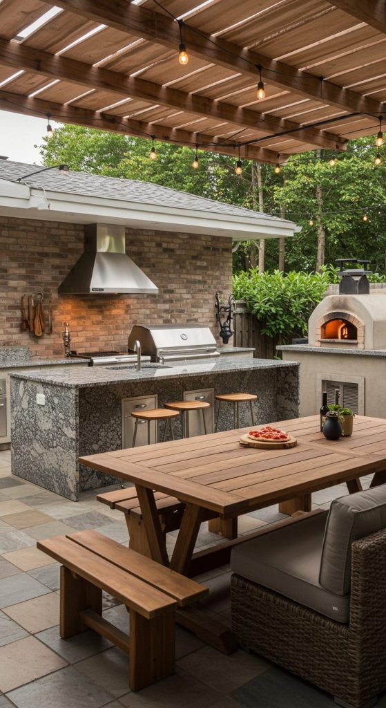 Design an expansive outdoor kitchen complete with a large grill, pizza oven, and prep counters. Include a dining area with a long table and a lounge zone with comfortable outdoor sofas.