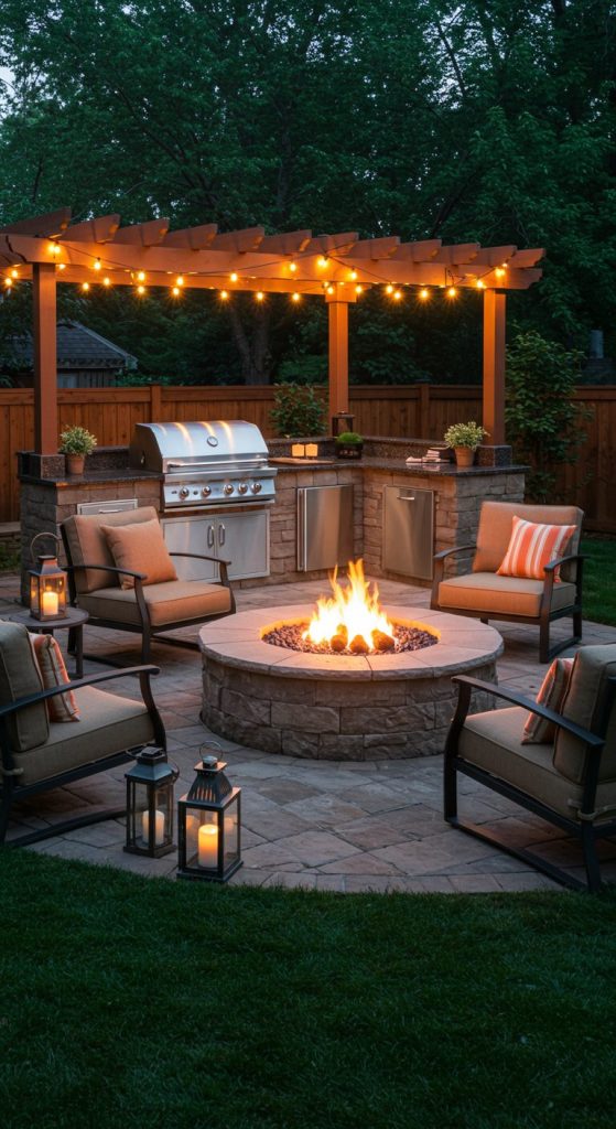 Pair your grill with a central fire pit for warmth and ambiance. Use stone or concrete for the fire pit, complemented by outdoor seating, and integrate a small prep station nearby.