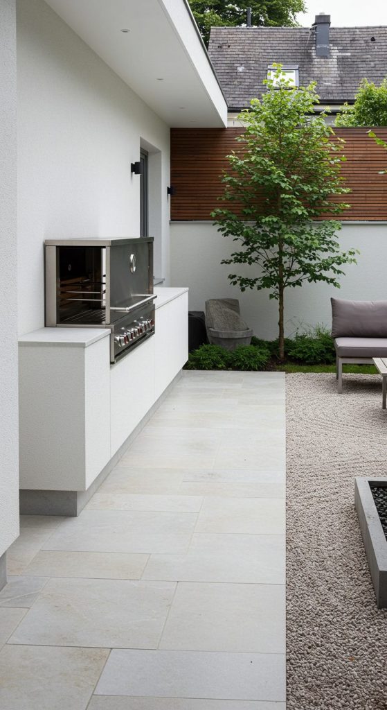 9. Minimalist Zen Patio with Built-In Grill
