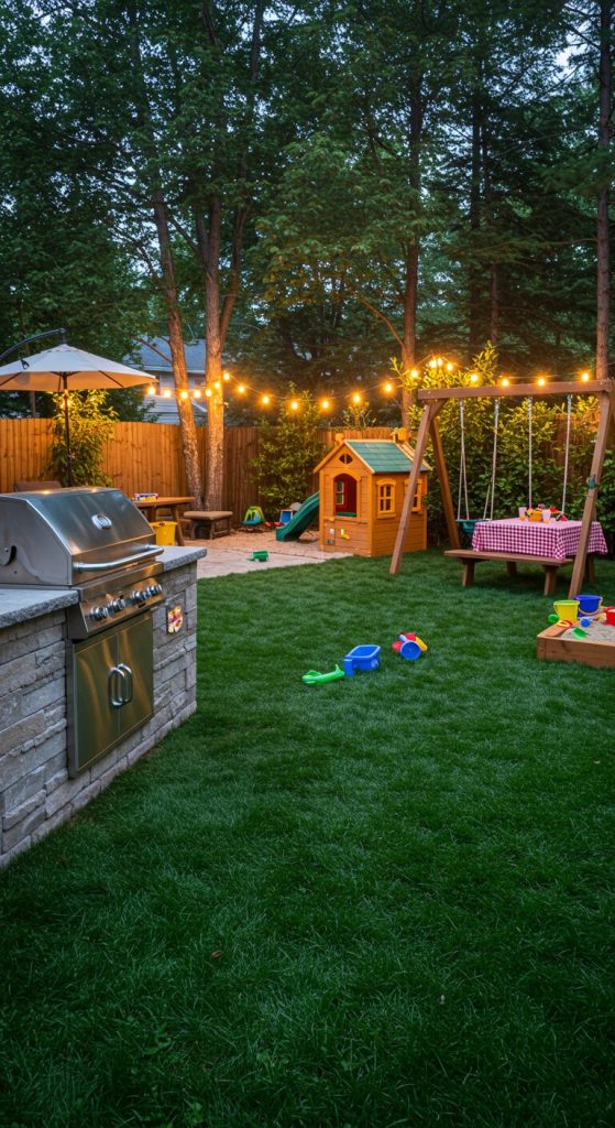 Design a family-friendly space with a safe, easy-to-maintain grill area, along with a play zone for children—think sandbox, swing set, or small climbing wall.