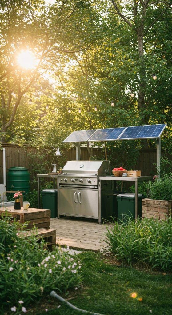 Sustainability meets style with solar-powered grills, compost bins, and native plant landscaping. Use reclaimed materials for furniture and incorporate rainwater harvesting systems.