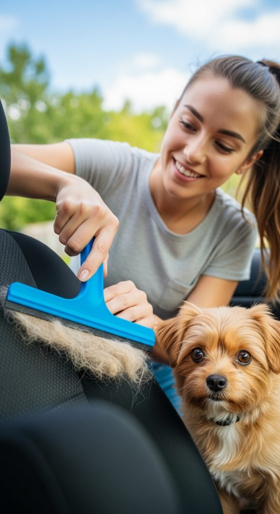 If you travel with furry friends, pet hair clings to your seats like glue. Lightly mist the upholstery with water and use a rubber squeegee to collect the hair into clumps for easy removal.
