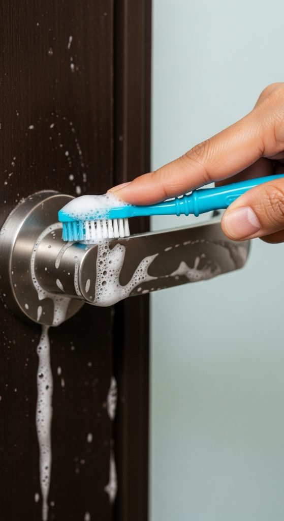An old toothbrush works wonders on textured surfaces, seams, and door handles where grime builds up. Its bristles get into the grooves easily.