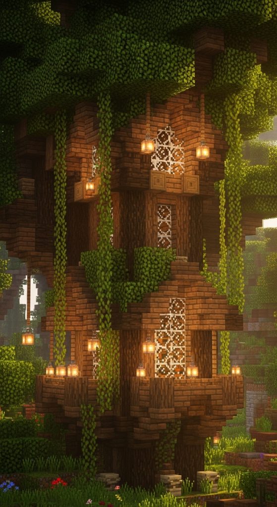 Decorate the exterior with hanging lanterns, flowers growing from the bark, and roots wrapping around the base. This build feels magical, cozy, and wonderfully immersive.