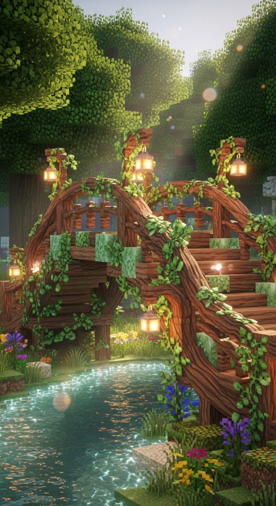 Line the bridge with lanterns, flowers, and leaves. Add vines hanging from the sides and glow berries beneath the arch. The bridge should feel like a gentle crossing between two enchanted areas.