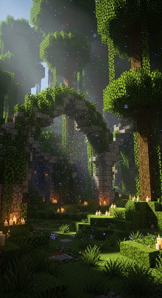 Let vines, moss, and leaves take over the structure. Trees growing through the ruins add drama and depth. Small glowing elements like candles, lanterns, or end rods hidden in foliage suggest lingering magic.