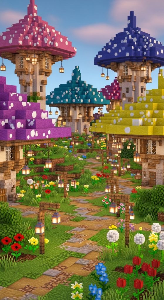 A fairycore mushroom village brings storybook charm to life. Instead of traditional houses, each home is a mushroom—some tall and narrow, others wide and squat. Use red and brown mushroom blocks, concrete, or wool to shape the caps, and wood or stems for the bases.