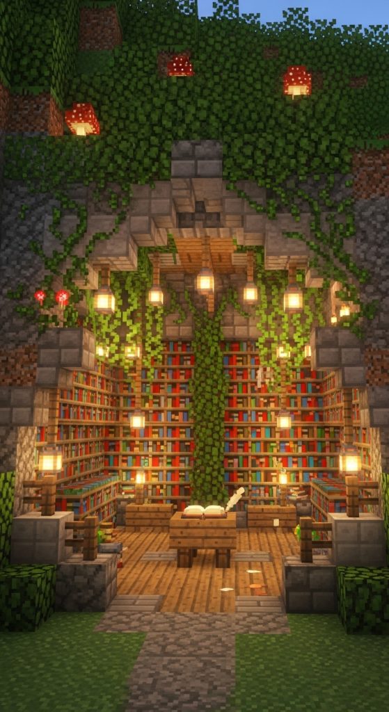 Add candles, lanterns, and glow berries for soft lighting. Reading nooks, ladders, and scattered papers give the library a scholarly yet whimsical feel. This build works wonderfully as a lore hub or enchanting area.