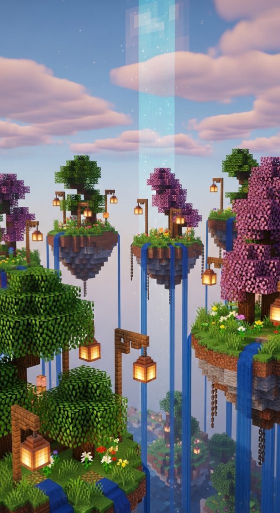 Connect islands with bridges made from chains, slabs, or vines. Add waterfalls that cascade into nothingness and lanterns floating beneath the islands. These builds work especially well at sunset or sunrise, when the lighting enhances the magical atmosphere.