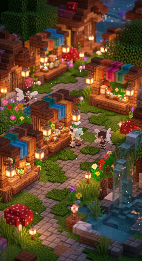 Fairy markets add life and storytelling to your world. These builds consist of small stalls made from wood, wool, and banners, each selling something different—flowers, potions, books, or food. Use barrels, item frames, and cauldrons to decorate the stalls.