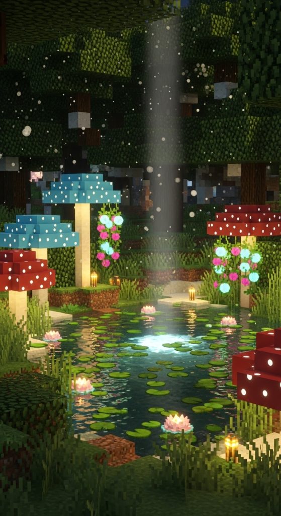 Around the pond, add oversized mushrooms, moss blocks, azalea bushes, and tall grass. Glow berries hanging from leaves create the illusion of floating fairy lights. Small bridges made from slabs or trapdoors can cross parts of the pond, making it feel interactive.