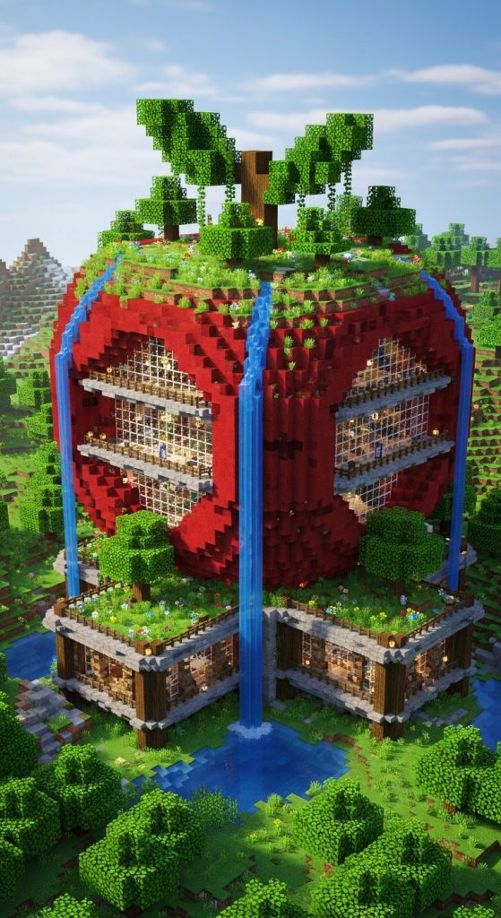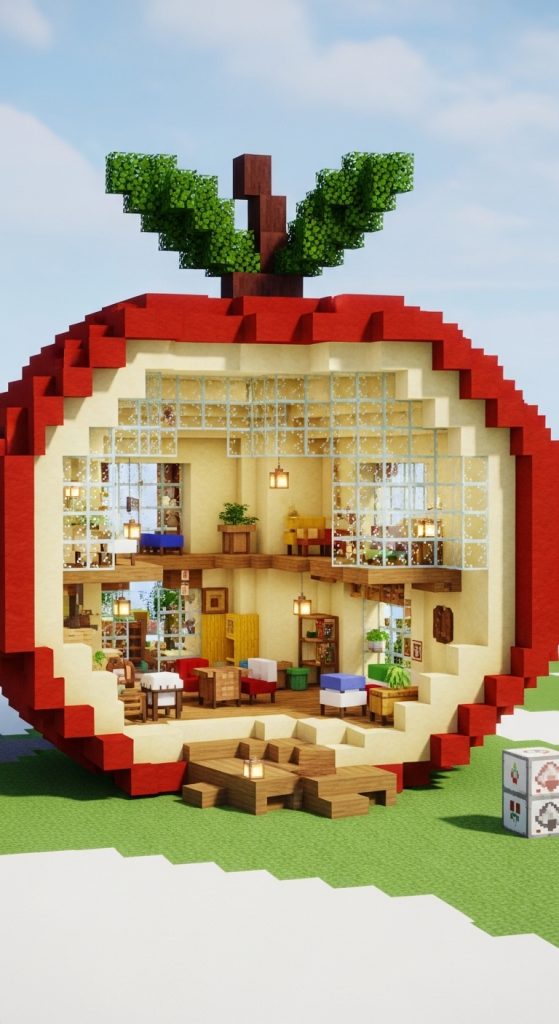 Apple-inspired houses combine vibrant colors, cozy interiors, and whimsical landscaping. Their rounded shapes, leafy roofs, and fairy-tale aesthetics make them perfect for forest biomes, cottagecore worlds, and fantasy survival maps. Whether you prefer a realistic apple design or a magical interpretation, these builds offer both functionality and visual appeal.