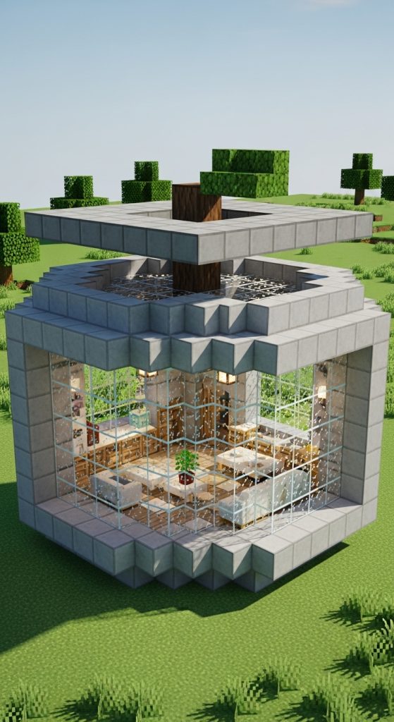 For players who prefer sleek aesthetics, the Modern Apple House uses smooth concrete, quartz, and glass.