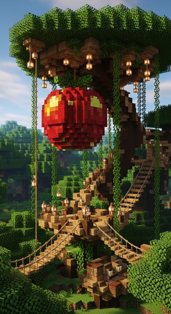 Vines, lanterns, and rope bridges connecting nearby trees elevate the design. It’s perfect for jungle or forest biomes and keeps mobs away thanks to elevation.