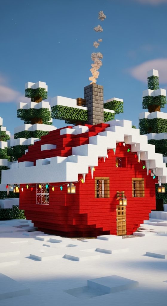 Built in snowy biomes, the apple roof is topped with snow layers and ice accents. Use spruce wood for doors and windows to match the cold environment.