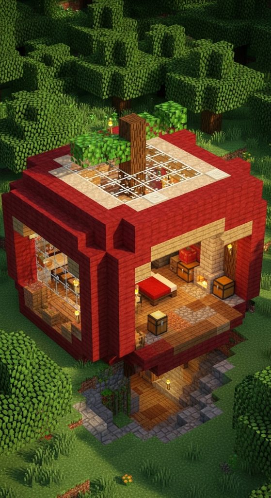 The Classic Red Apple Cottage is the most iconic starter design. Built using red wool, red concrete, or terracotta, this house mimics the natural roundness of an apple. White concrete or diorite accents create a glossy “apple shine” effect.