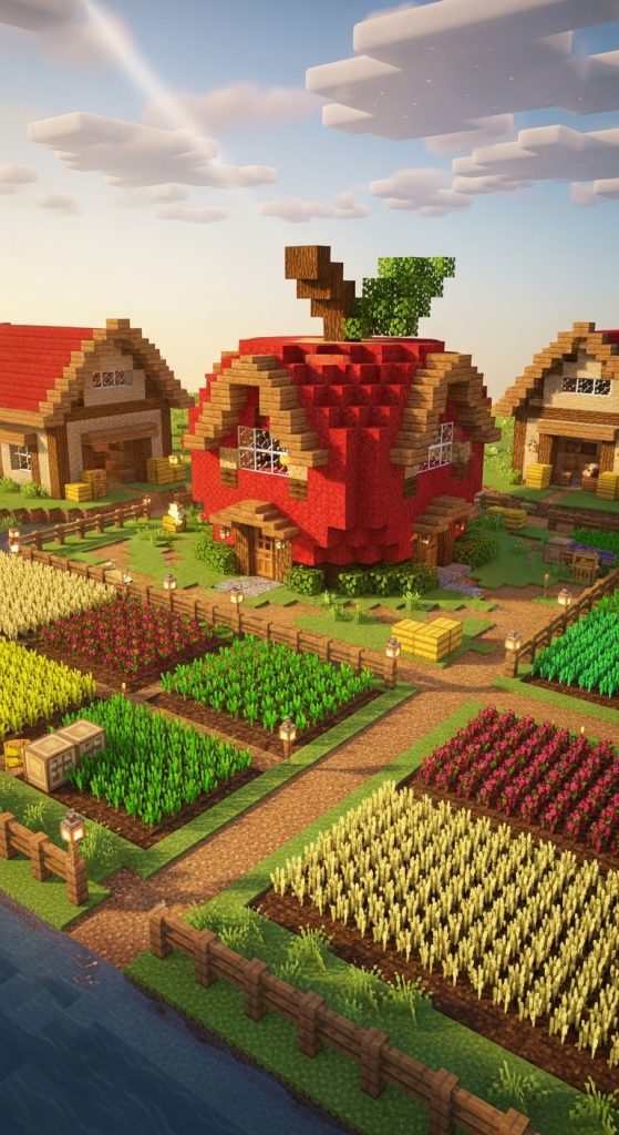 The apple structure serves as your living quarters, while attached barns, crop fields, and animal pens create a working homestead. Use fences, hay bales, and wagons for realism.