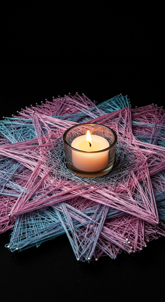 Description: Create candle holders out of foam board by wrapping string around nails forming a design, and placing a small candle at the center.