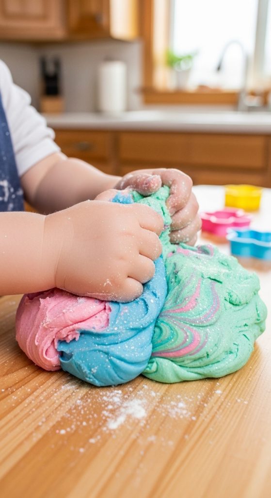 Combine playtime with taste-safe fun by making edible glitter playdough. Mix marshmallows, powdered sugar, and a bit of cornstarch, then add food coloring and edible glitter. Toddlers can knead, squish, and shape this dough while exploring colors and textures.