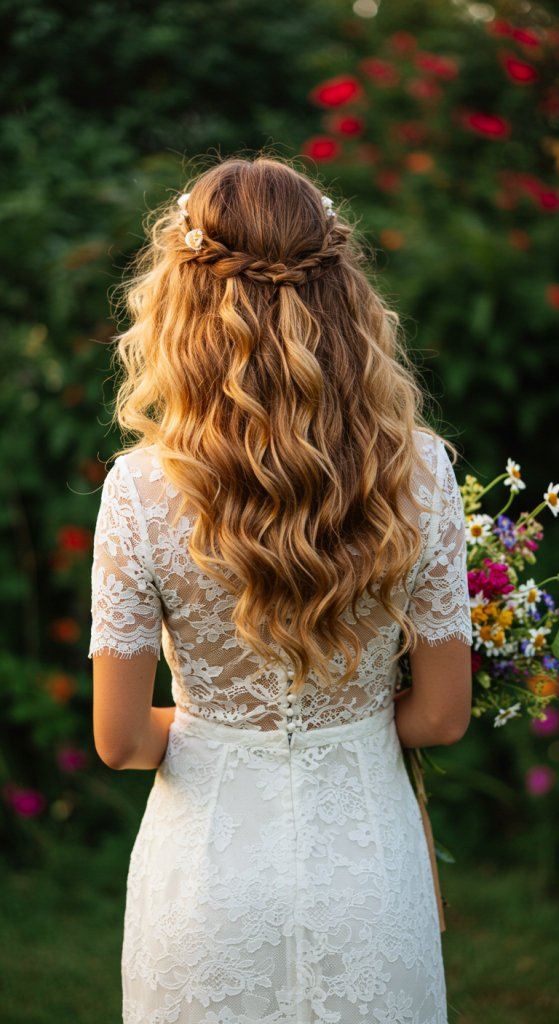 For a romantic and playful look, consider half-up, half-down curls. This style involves curling the bottom half of your hair while leaving the top half free, secured with a beautiful hair clip or ribbon.