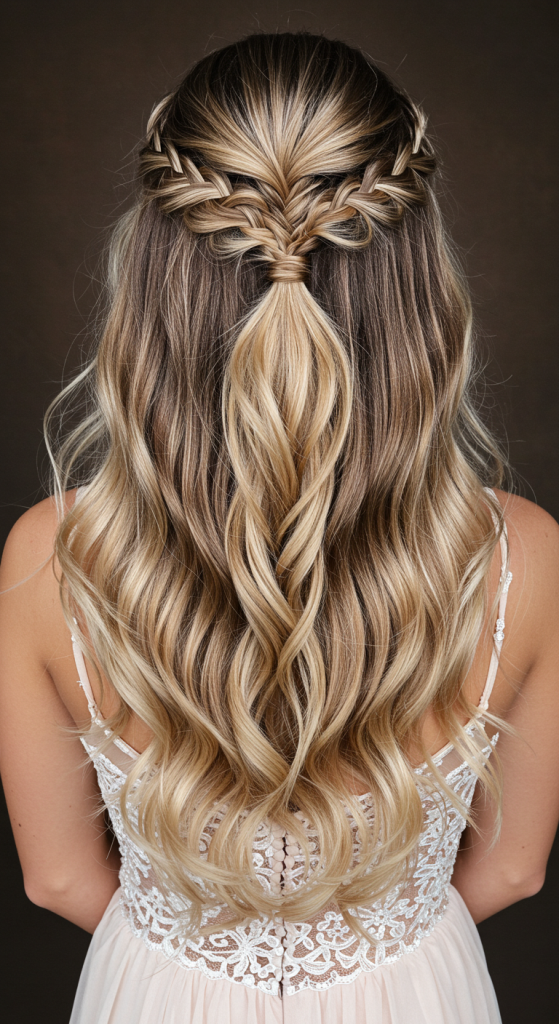 Description: Combine waves with a half-up braid for a romantic twist. This hairstyle is youthful and charming, perfect for a fun prom night.