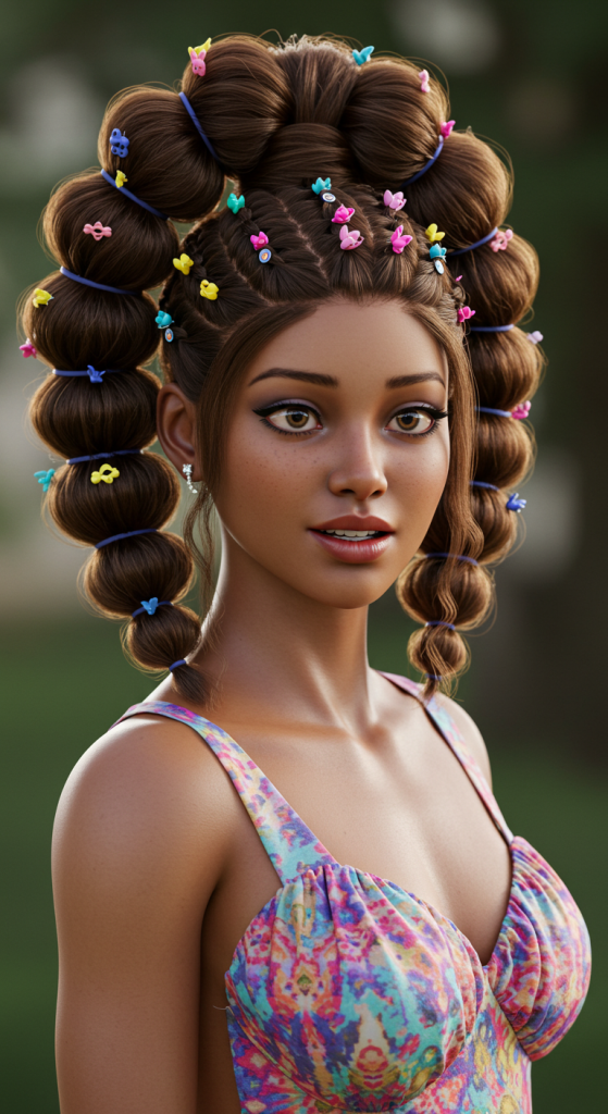 Description: The bubble ponytail is playful yet chic. It involves sectioning the ponytail with mini hair ties, resulting in a bouncy, voluminous appearance.