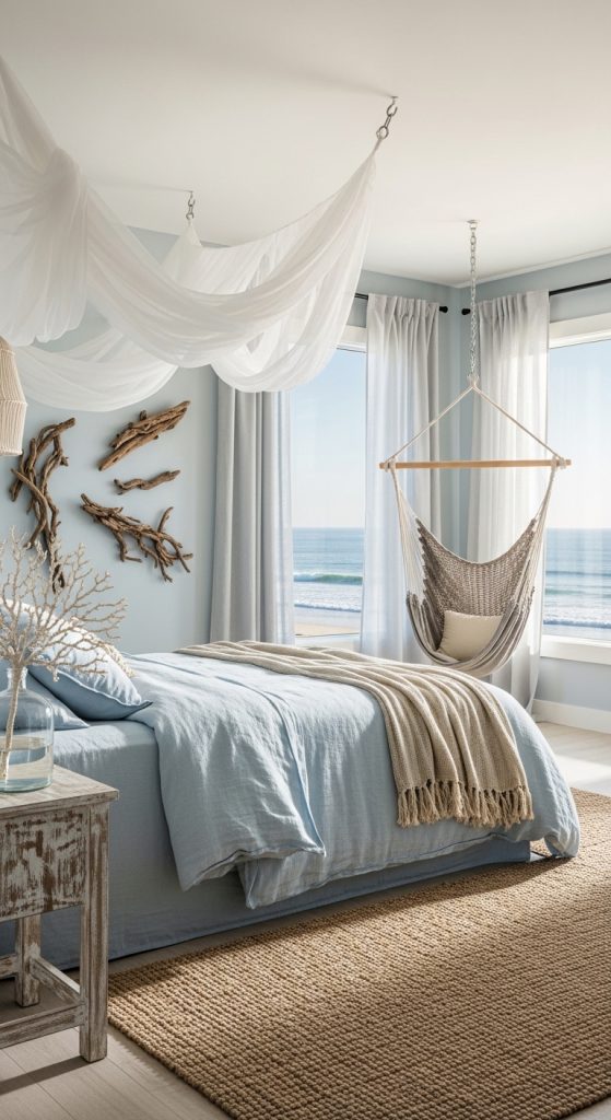 Bring the calm of the ocean into your bedroom with a coastal-inspired retreat. Soft blues, sandy beiges, and crisp whites mimic the colors of the sea and shore. Nautical accents such as rope mirrors, driftwood décor, and ocean-themed prints tie the theme together. A hammock chair, light linen bedding, and airy curtains create a breezy, relaxing vibe. The room feels like a serene beach vacation every day.