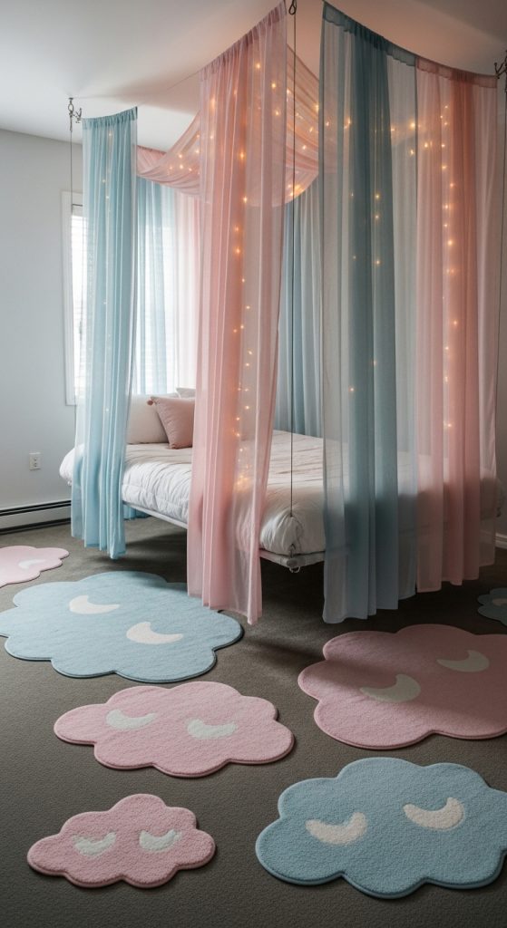 Imagine drifting off under a ceiling of soft, billowy clouds. A floating canopy bed surrounded by sheer, whisper-light fabrics creates the illusion of sleeping in the sky. Soft pastel tones of blush pink, powder blue, and creamy white add an airy, serene feeling. Twinkling fairy lights integrated into the canopy lend a magical glow, turning the room into a dreamy escape. Add a fluffy cloud-shaped rug and oversized pillows for maximum playfulness.