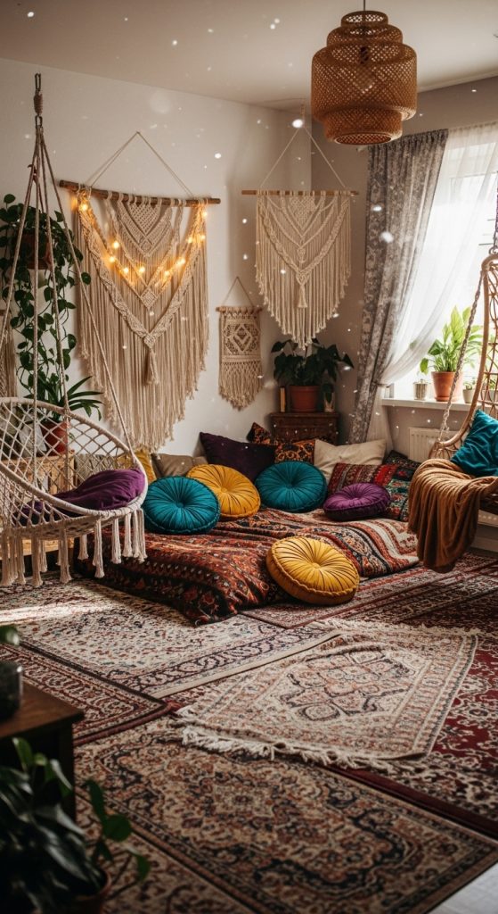 Boho bedrooms are all about freedom, creativity, and texture. Layered textiles, patterned rugs, macramé wall hangings, and an eclectic mix of cushions create a playful yet elegant aesthetic. Add hanging chairs or canopy swings for a touch of whimsy. Earthy tones mixed with pops of jewel colors ensure that the room feels inviting, warm, and full of character.