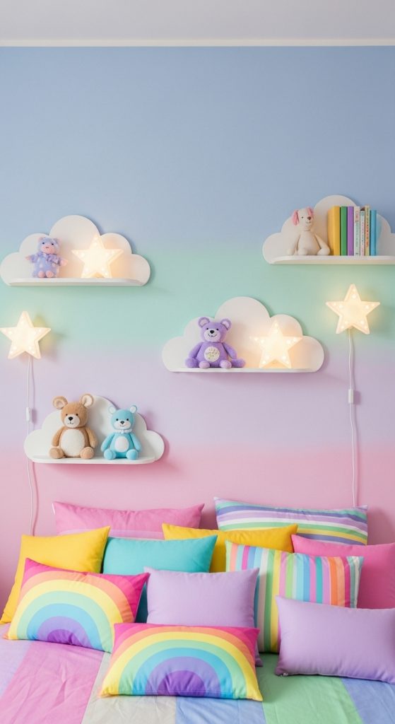 Who says bedrooms have to be monotone? A pastel rainbow theme injects color without overwhelming the senses. Soft gradients of pink, lilac, mint, and powder blue across walls or bedding make the space feel cheerful yet soothing. Curved furniture, cloud-shaped shelves, and whimsical accessories like star lamps or rainbow pillows make this bedroom playful, chic, and picture-perfect for social media.