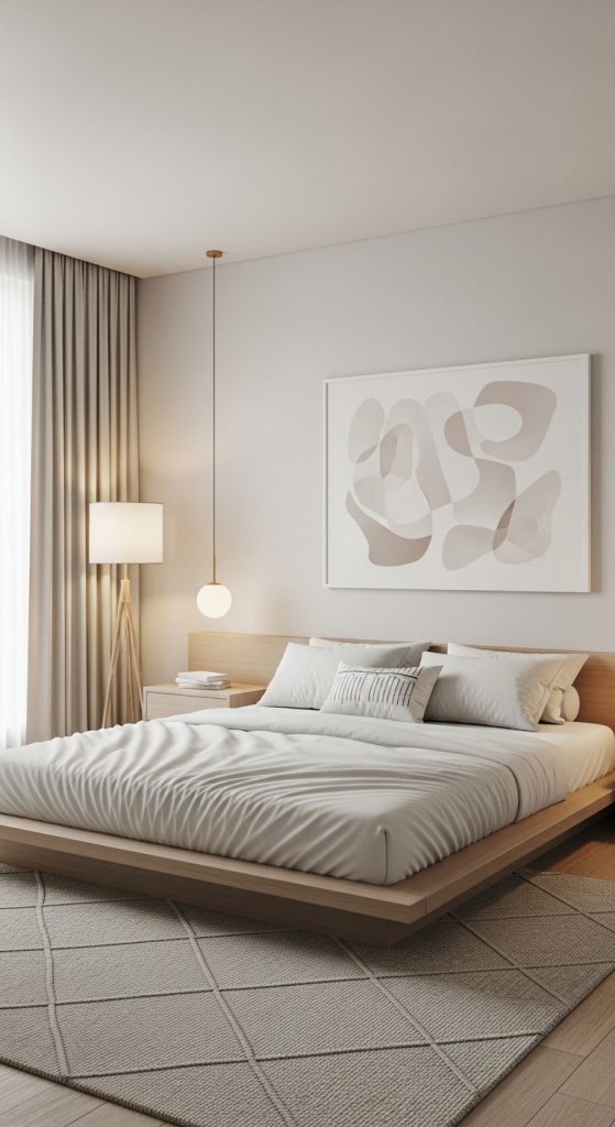 Sometimes less is more. A minimalist dream bedroom focuses on clean lines, neutral tones, and high-quality materials. Think soft greys, crisp whites, and light woods. A platform bed with a low-profile headboard, sleek nightstands, and minimalist lighting create an atmosphere of calm sophistication. Despite the simplicity, clever design touches like geometric patterns, subtle textures, and statement art pieces ensure the room remains visually captivating.
