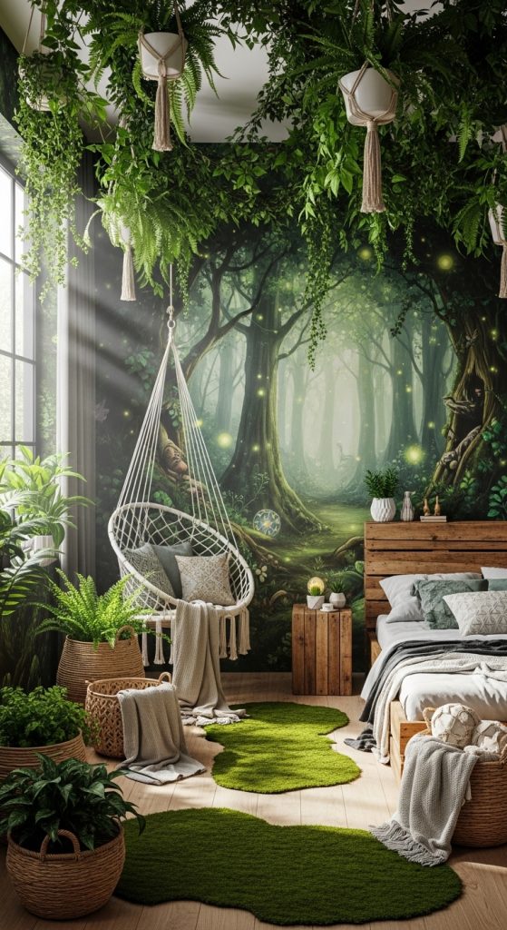 Bring nature indoors with a magical forest-themed bedroom. Think large leafy green wallpaper or hand-painted forest murals combined with warm wooden furniture. Incorporate natural textures like rattan chairs, woven baskets, and a mossy green rug. A corner hammock or teepee adds a playful, adventurous vibe. This space not only encourages relaxation but also sparks imaginative play for anyone young at heart.