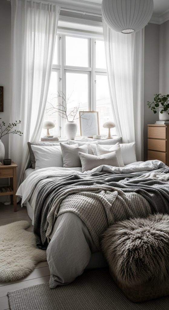Scandinavian design is renowned for its balance of functionality, comfort, and elegance. Neutral palettes, natural materials, and soft textiles dominate this bedroom style. Layered blankets, plush cushions, and faux fur rugs add warmth, while wooden furniture keeps the space grounded and inviting. Large windows with soft flowing curtains let natural light pour in, creating a serene and cozy dream environment.