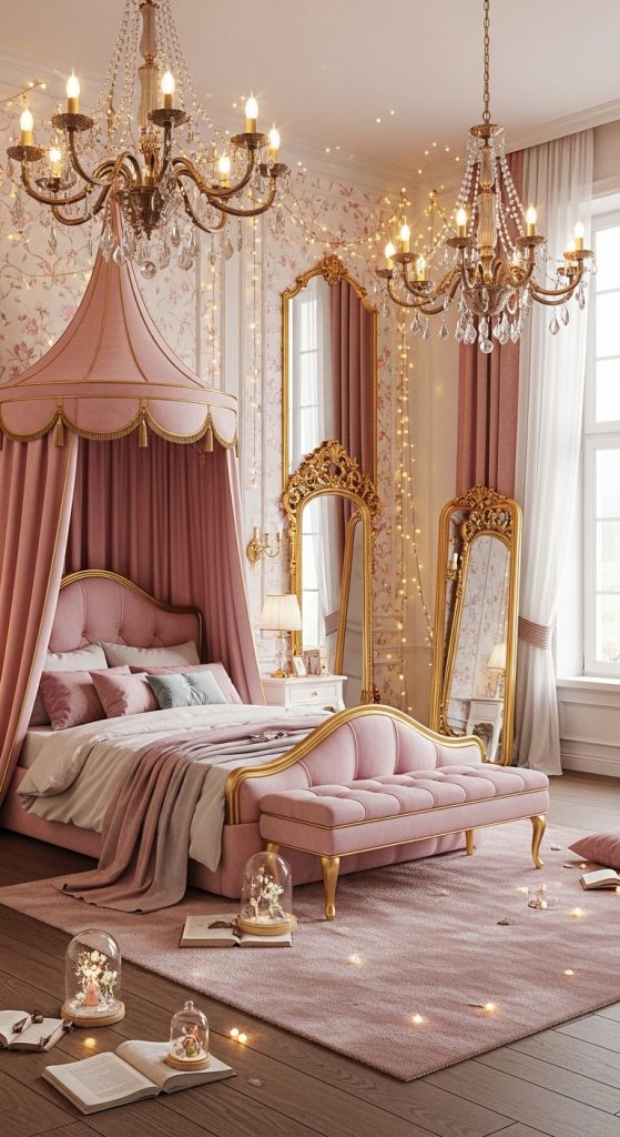 Bring classic fairy tales to life with a bedroom that feels like a storybook. Luxurious four-poster beds with draped velvet curtains, ornate chandeliers, and gilded mirrors evoke royal elegance. Soft pinks, golds, and ivory dominate the color palette, with whimsical touches like miniature fairy lights, delicate floral arrangements, and vintage-inspired furniture. This bedroom sparks a sense of wonder and transports anyone into a magical world.