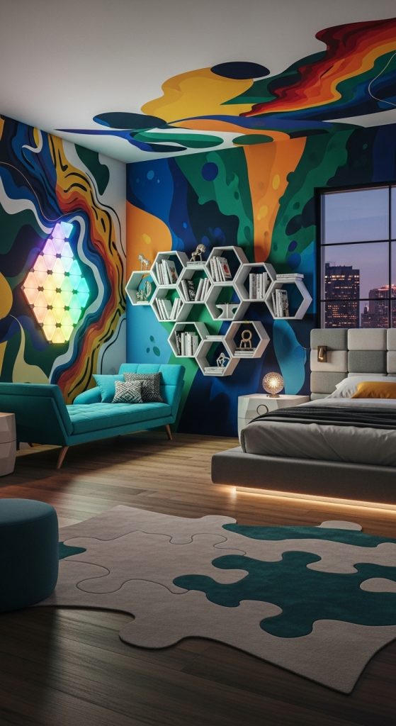 For the creatively inclined, a modern artistic bedroom offers bold expression and play. Walls can feature abstract murals, gallery frames, or geometric patterns in vibrant colors. Furniture with unconventional shapes, modular shelving, and interactive décor like magnetic boards or chalk walls create a dynamic space for both rest and creativity. This bedroom is not only functional but also a canvas for imaginative play.