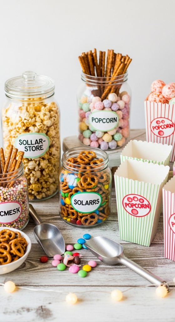 Create a snack station with freshly popped popcorn and toppings. Label everything with handmade tags or printable labels, and use color-coordinated serving cups or boxes from Dollar Tree.